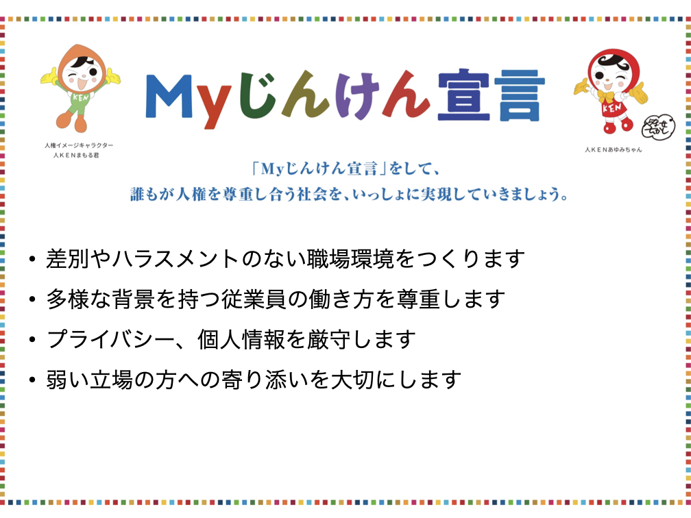 この Myじんけん宣言は、オカタシの全ての事業活動における基本姿勢として掲げ、従業員教育や社内ルールの整備、サービス品質向上に取り入れてまいります。